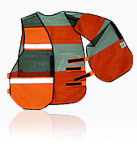 Colete em tela, tira de PVC, fita refletiva centralizada, com elástico nas laterais, fechamento frontal através de velcro ou botões de pressão plásticos, acabamento em viés em toda a volta.